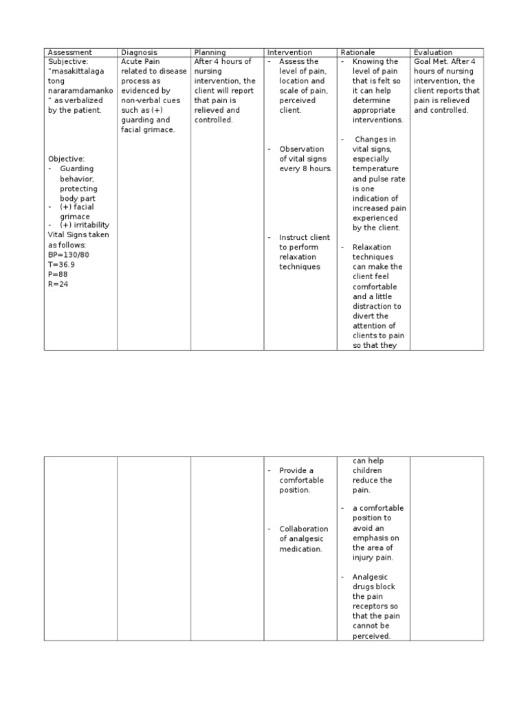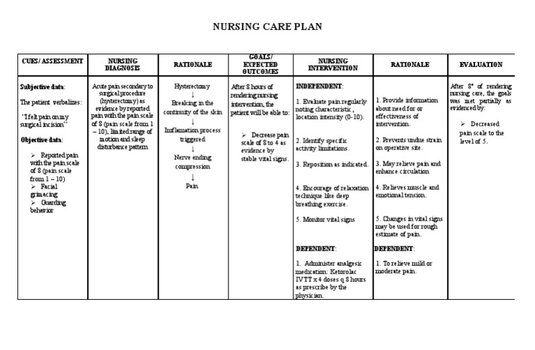 Nursing care plan for acute pain related to hysterectomy. Struggles with Activities of Daily Living. Acutechronic Pain related to disease processcompression or destruction of nerve tissue infiltration of nerves or their vascular supply obstruction of a nerve pathway inflammation metastasis to bones. States 910 on pain scale that is described as Charlie horse cramps of abdomen.